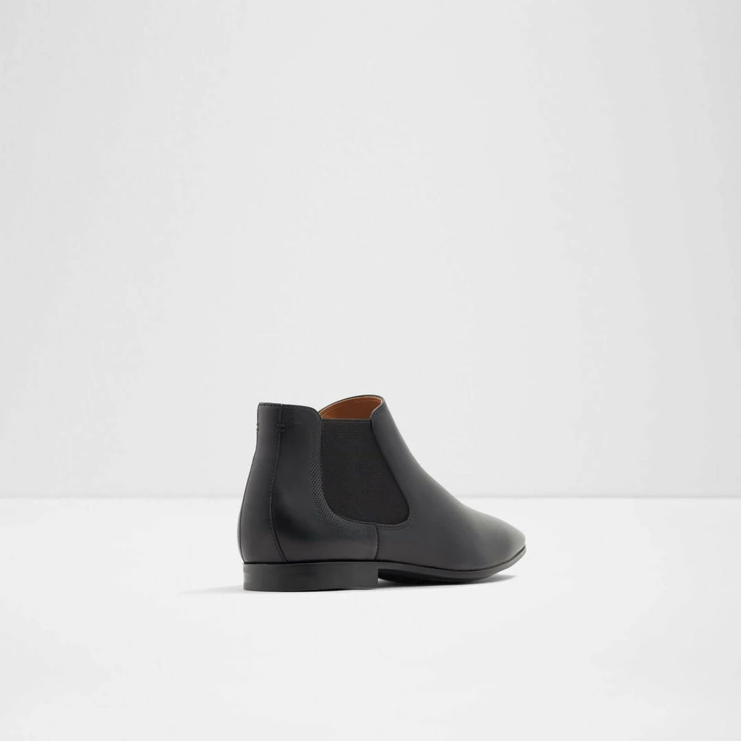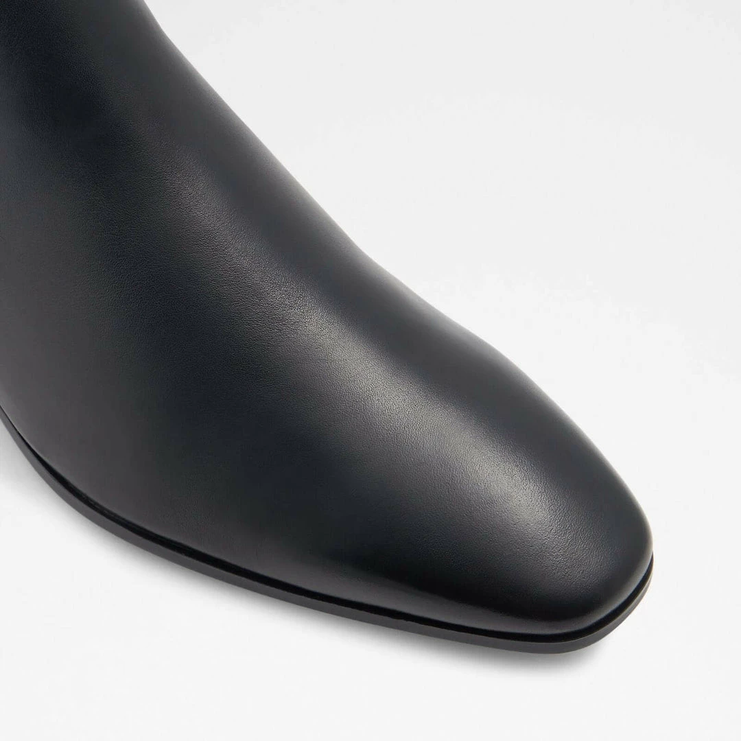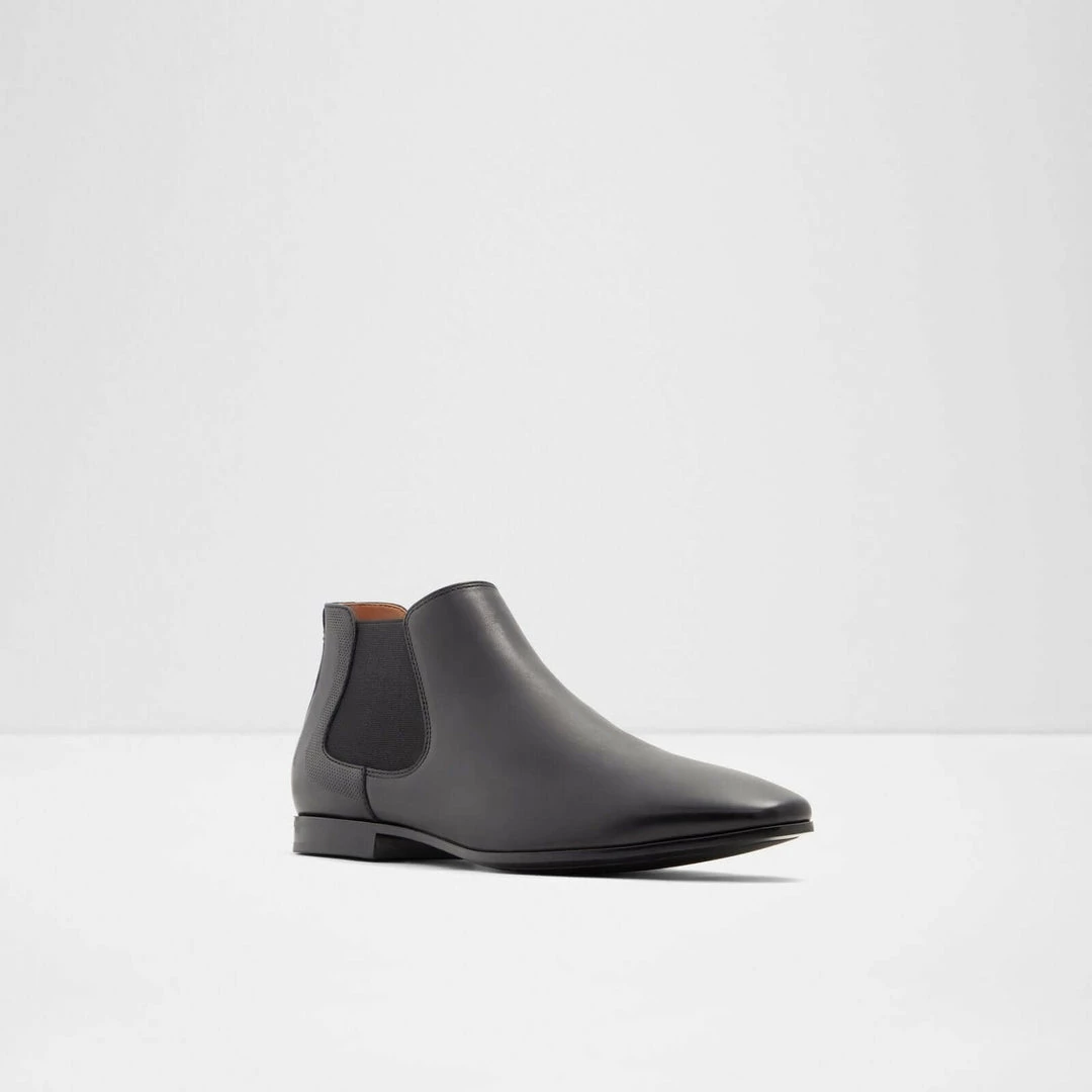 #Style notes *With a pointy toe and lower on the ankle fit, the men’s Chelsea boot reimagined for a dressier option to finish suits and your dress denim. #Details * Chelsea ankle boot * Square toe * Slip on * Colour Black #Materials *Upper: Leather *Sole: Rubber