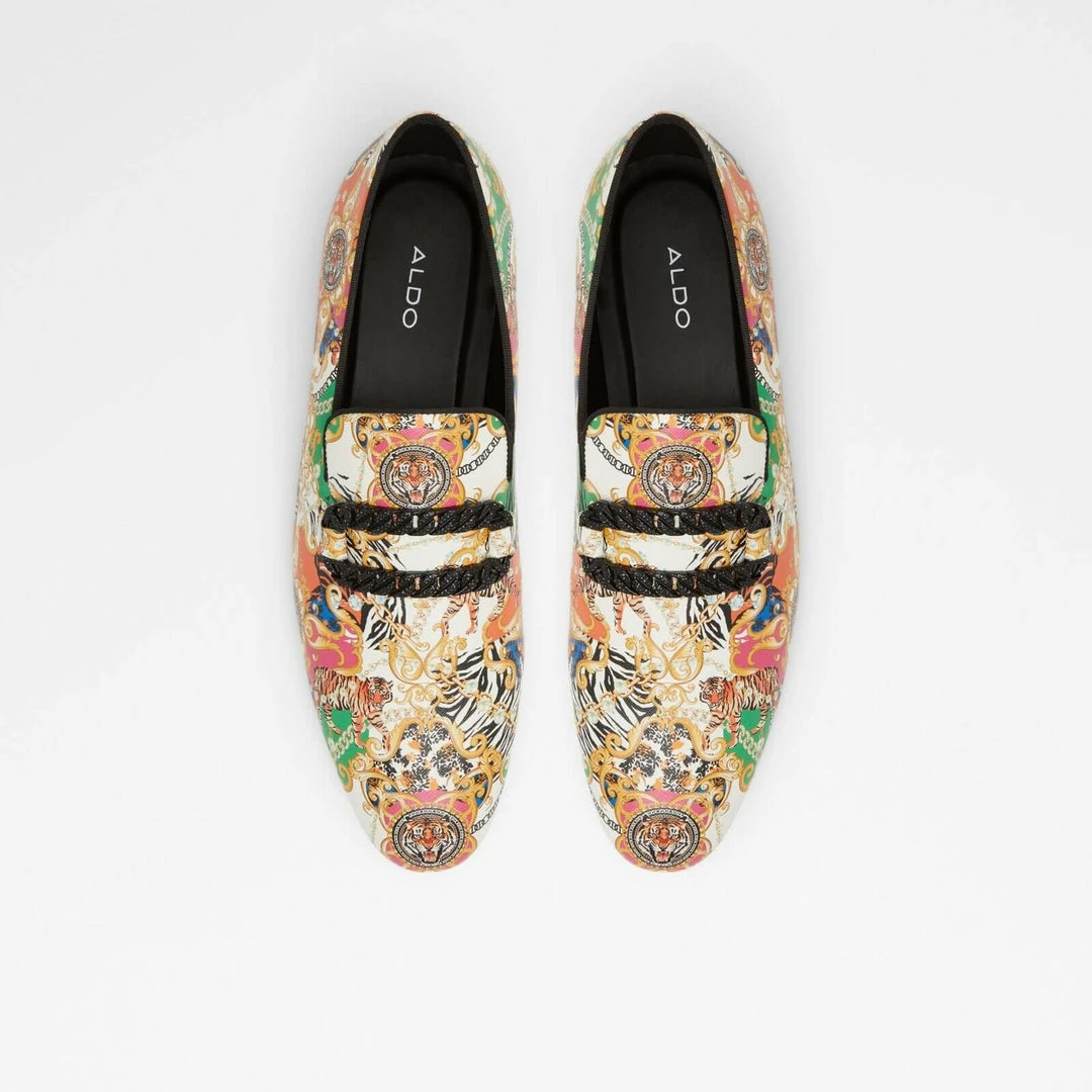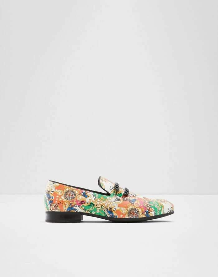 #Style Notes *Slip back to the ’70s in these vintage inspired loafers featuring a gnarly chain detail, tapered almond toe construction, and ultra comfy soles. They’ll be sure to spark some conversations. #Details *Colour: Black Multi *Heel Height: 0.00 In (0.00 Cm) *Heel Type: Flat Or No Heel #Materials *Main Material: Synthetic *Sole Material: Rubber