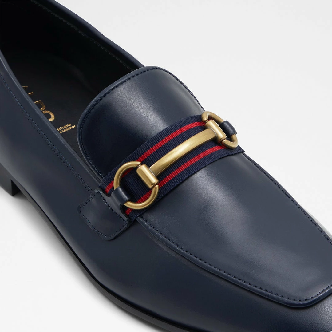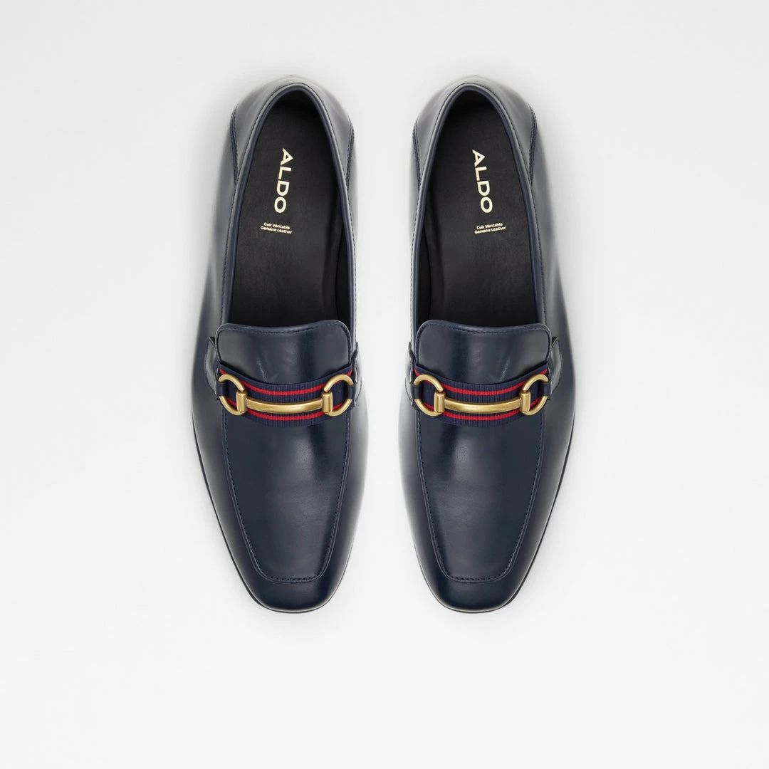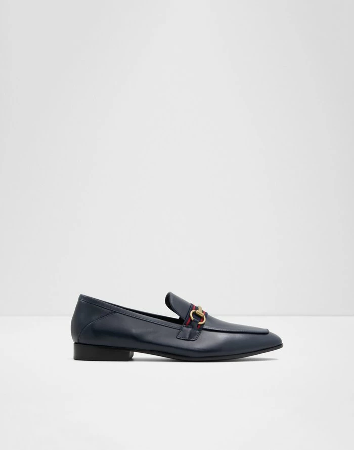#Style notes *The modern metal keeper and almond toe of these smooth leather loafers are all you need to spice up your formal wear wardrobe. #Details * Slip-on * Closed almond toe * Slip-on * Metal ornament * Colour Navy #Materials *Upper: Leather *Main: Smooth *Sole: Smooth #Measurements *Heel height: 0.75 cm