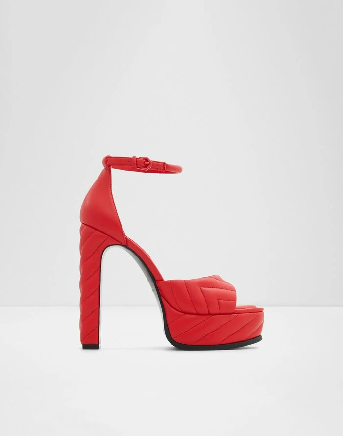 #Style notes *The iconic platform heel silhouette gets a modern upgrade courtesy of luxe quilting design. Obsessed is an understatement. #Details * Ankle strap heeled sandal * Open round toe * Flatform * Buckle closure * Colour Red #Materials *Upper: Synthetic *Sole: Rubber #Measurements *Heel height: 5.25 cm *Platform height: 1.25 cm
