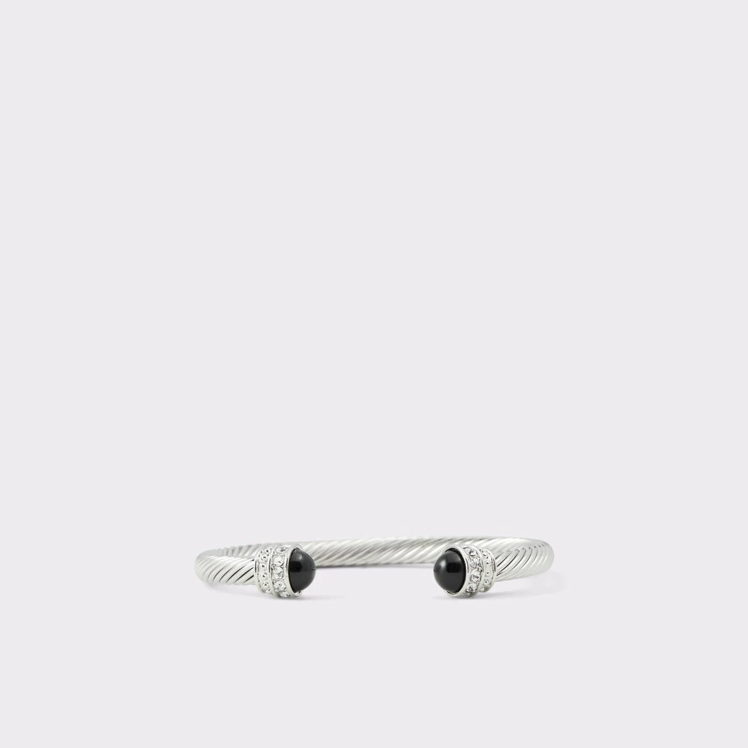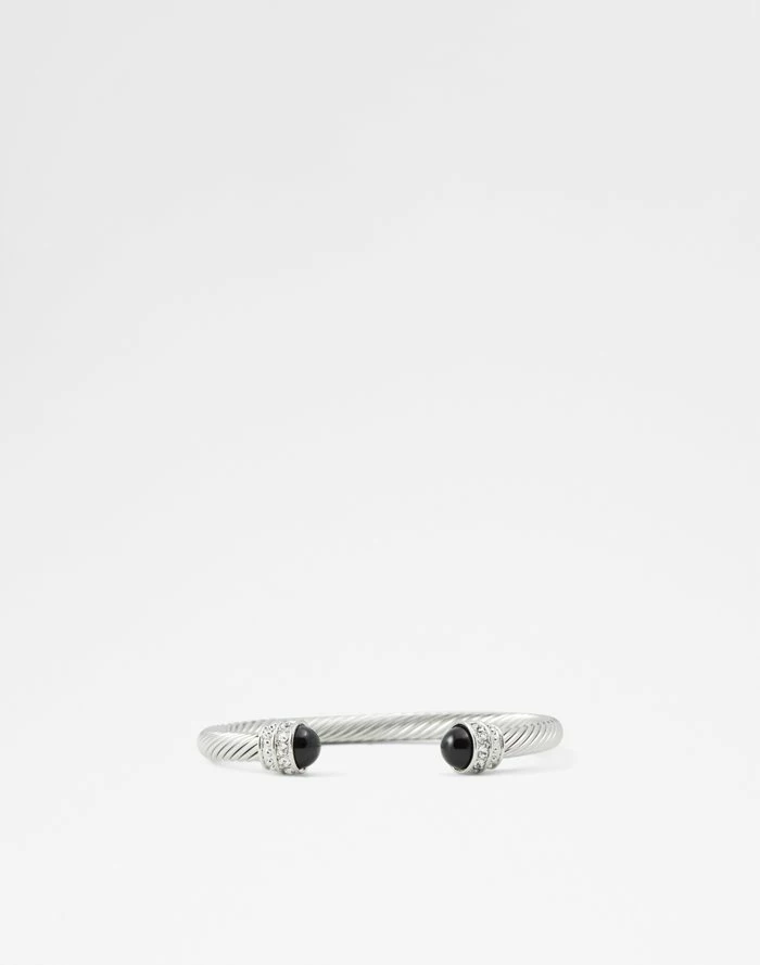 #Style Notes *Introduce an urban chic to any look with this silver-tone menβs bracelet. Simple, open bangle style features textured metal finish and jet-black tips for a punch of drama. #Details *Colour: Silver