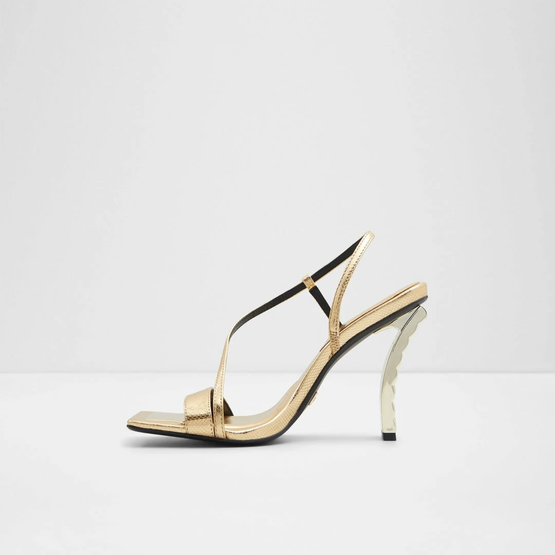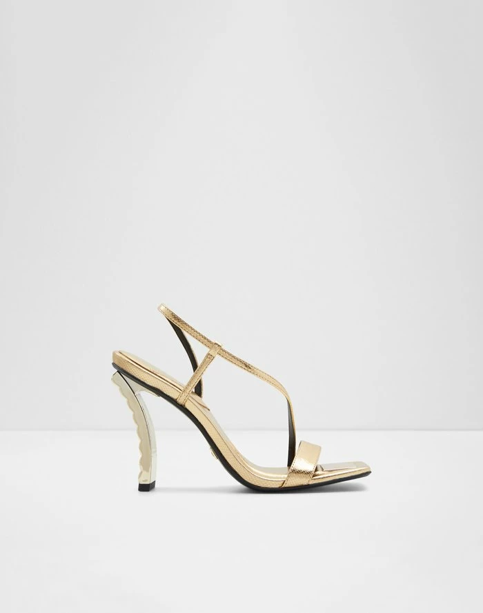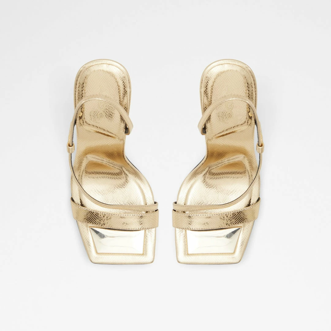 #Style notes *A watch strap design detail elevates these sling back high heels to luxe new heights. #Details * Sling back heeled sandal * Open square toe * Slip-on * Colour Gold #Materials *Upper: Leather *Main: Snake skin *Sole: Rubber #Measurements *Heel height: 3.75 cm